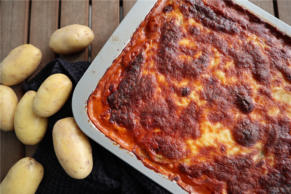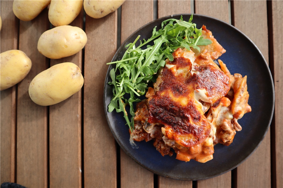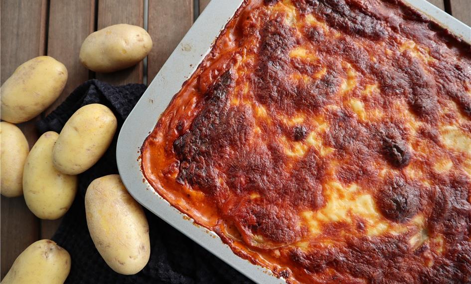 Når du skifter lasagnepladerne i en lasagne ud med kartoffelskiver, får du en dejlig, mættende ret med højt indhold af næringsstoffer. Det smager skønt og er, som traditionel lasagne, også rigtig god dagen efter.