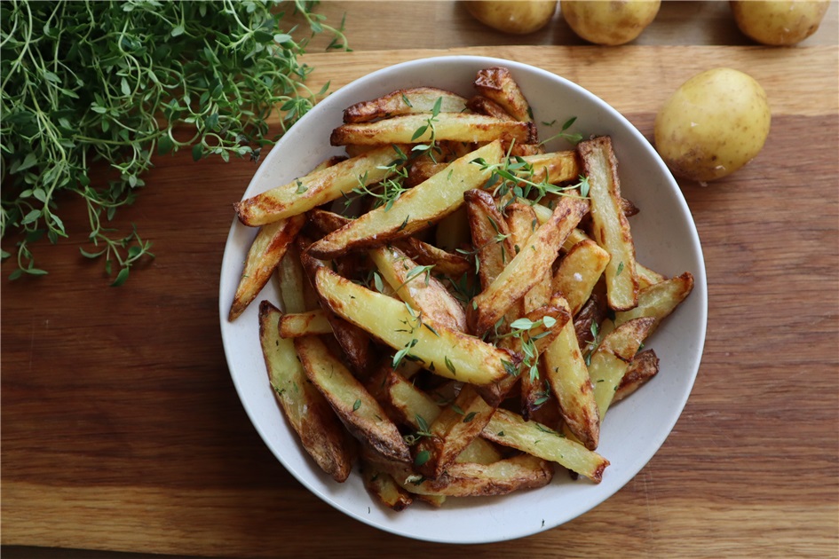 I en skål eller plasticpose vendes kartoflerne med lidt olie. Hæld dem derefter i airfryeren og giv dem 10 minutter på 200 grader. Ryst eller vend kartoffelstængerne og drys med salt og evt. friskhakket timian. Giv derefter kartoffelstængerne yderligere 15-20 minutter ved 200 grader til de er sprøde. Husk at vende et par gange undervejs, hvis din airfryer ikke har dobbelt varme.